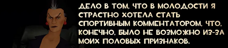-(долго глядит в потолок и закуривает) В детстве мне разрешали бегать с 14 до 15 часов дня, а ещё я ходила в особую школу для злых врачей. Но вообще, дело в том, что в молодости я страстно хотела стать спортивным комментатором, что, конечно, было не возможно из-за моих половых признаков.