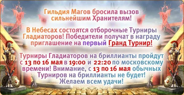 Пожелаем удачи всем отважным жителям небесных островов и пусть в Первом оффлайн Турнире Небесных гладиаторов победит сильнейший!