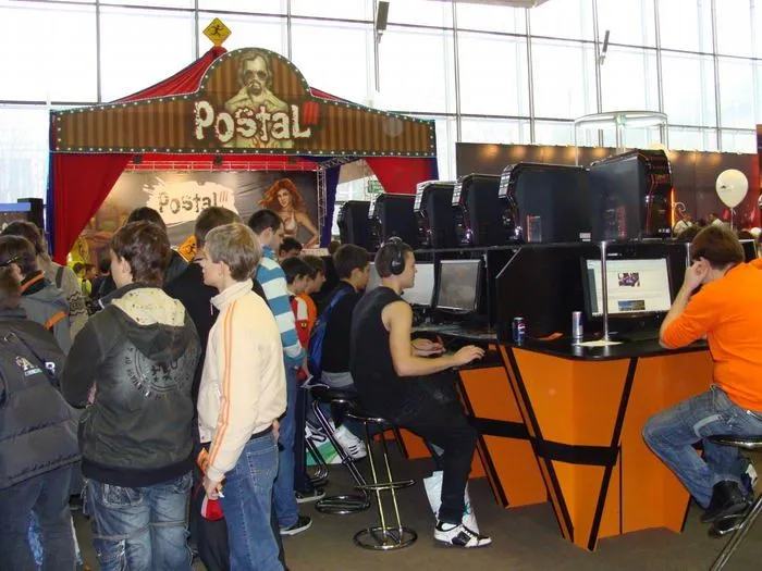Также свободно - при достаточной доле везения, разумеется, - можно было поймать какой-либо приз, брошенный со сцены. Свободно нельзя было только одного — поиграть в игры. Что не слишком удивительно при той чудовищной толпе посетителей, пришедших на выставку. Ещё бы, все школьник и студенты, не имевшие возможности посетить её в четверг и пятницу, приехали в субботу. Ради заветного билета народ стоял в очереди под проливным дождём (не все приобрели их заранее), и даже в 14.00 поток входящих посетителей не ослабевал.