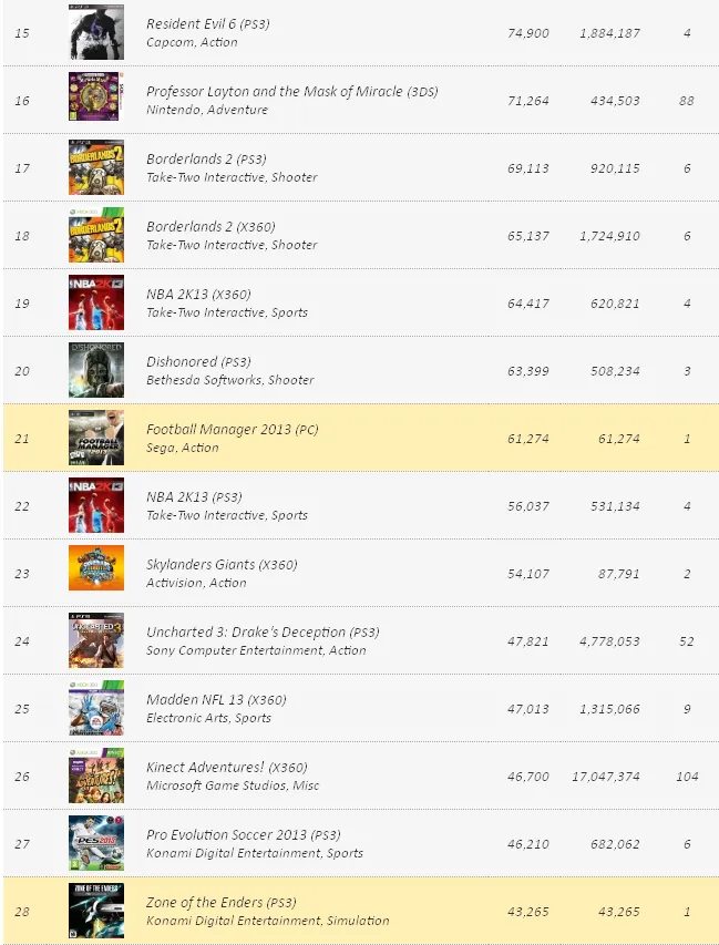 Еще одна новинка недели - Football Manager 2013 для PC, разместилась на 21 позиции. Игра за одну неделю разошлась тиражом в 61 тыс. копий.