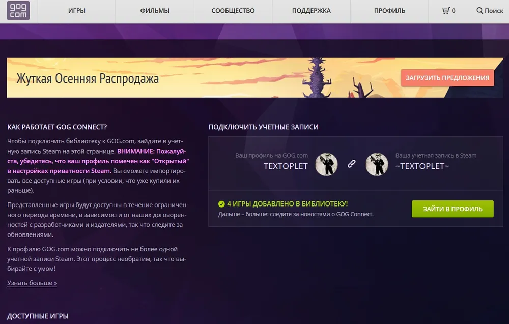 К профилю GOG.com можно привязать только одну библиотеку Steam. Этот процесс необратим.