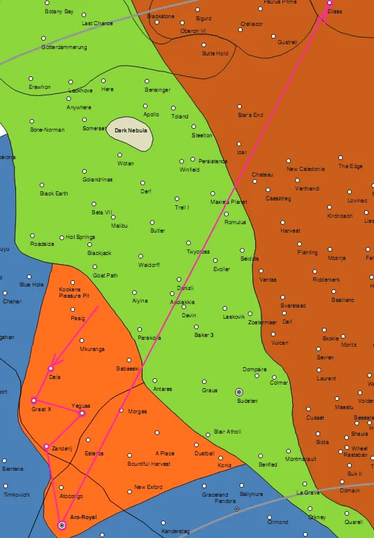 [10 июля] Красный Корсар прыгает в систему Грейт X, но бежит от шаттла "Луг" Гончих Келла и 31-ой Соламы Волков.