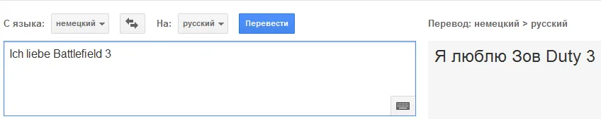 Google переводчик переводит Ich liebe Battlefield 3, как Я люблю Зов Duty 3, что на человеческом: "Я люблю Call of Duty 3".
