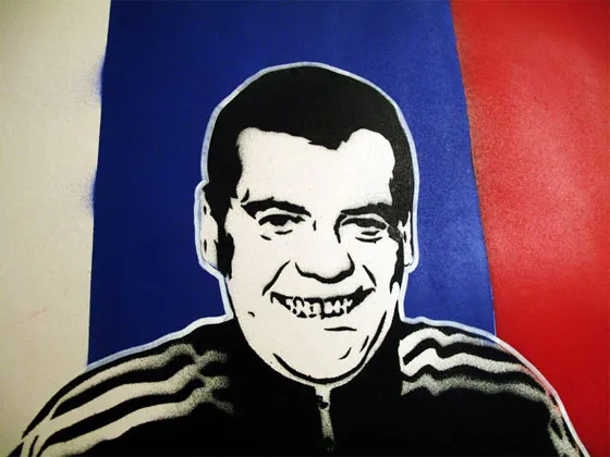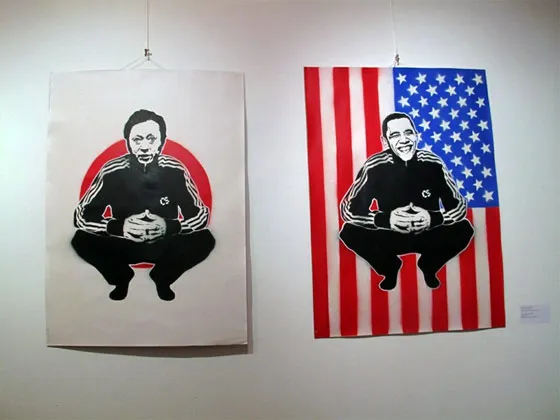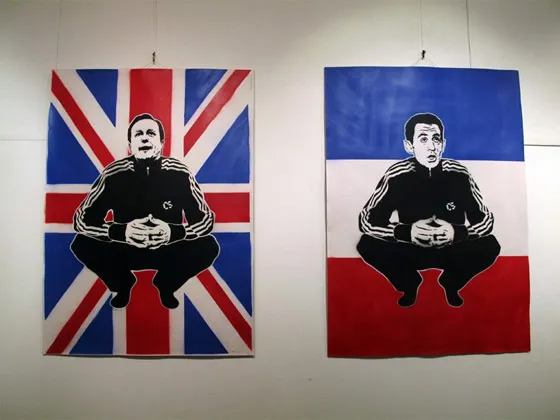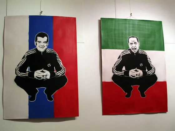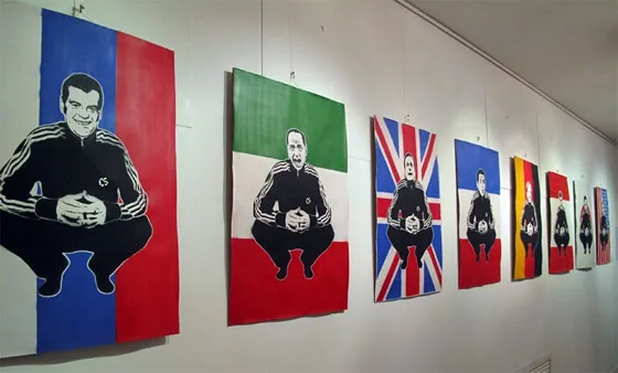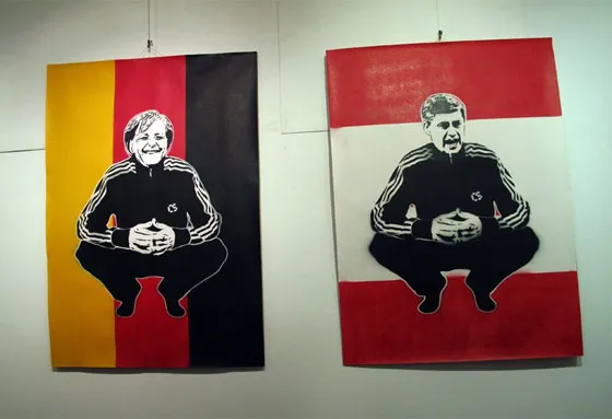 Граффити-художники выступающие в "трафаретной" технике представили свои работы. Наиболее четкой оказалась работа команды Sla!k - "G8". Руководители ведущих стран мира на фоне собственных флагов представлены ровными пацанчиками на корточках в престижных спортивных костюмах Adibas.