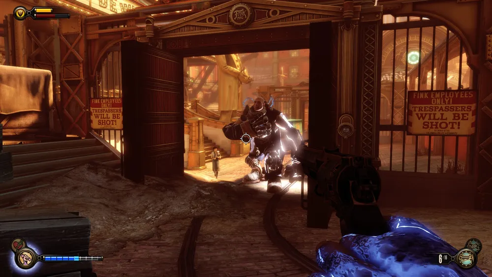 Необычные особенности – это не только плазмиды, между прочим. Теперь игроки могут вволю порезвиться на рельсах, протянутых практически по все Колумбии. Прицеливаемся на рельсу, нажимаем на пробел и – вуаля! – на всех скоростях мы несемся вверх (или вниз) с пушкой наготове. Стрелять, если честно, с этих штукенций неудобно, но, тем не менее, рельсы очень даже полезны. Дело в том, что в отличие от прошлых частей, в которых все действо происходило в довольно замкнутых пространствах, новый Биошок предоставляет нам возможность повоевать на действительно больших пространствах и, часто, удобнее всего занять боевую позицию как можно выше, дабы иметь наиболее полный обзор на то, что происходит внизу. Вот тут-то нас рельсы и выручают: запрыгиваете с помощью рельс на какую-нибудь башню, да и уничтожаете всех супостатов с помощью снайперской винтовки, а, затем, снова мчитесь по рельсам, но на это раз уже прямо на летающую баржу противников, чтобы разобраться со спрятавшимися на ней противниками. Игра нарочно заставляет не стоять на месте, постоянно двигаться, перепрыгивать с рельс на землю и обратно, что придает игре должную динамику.