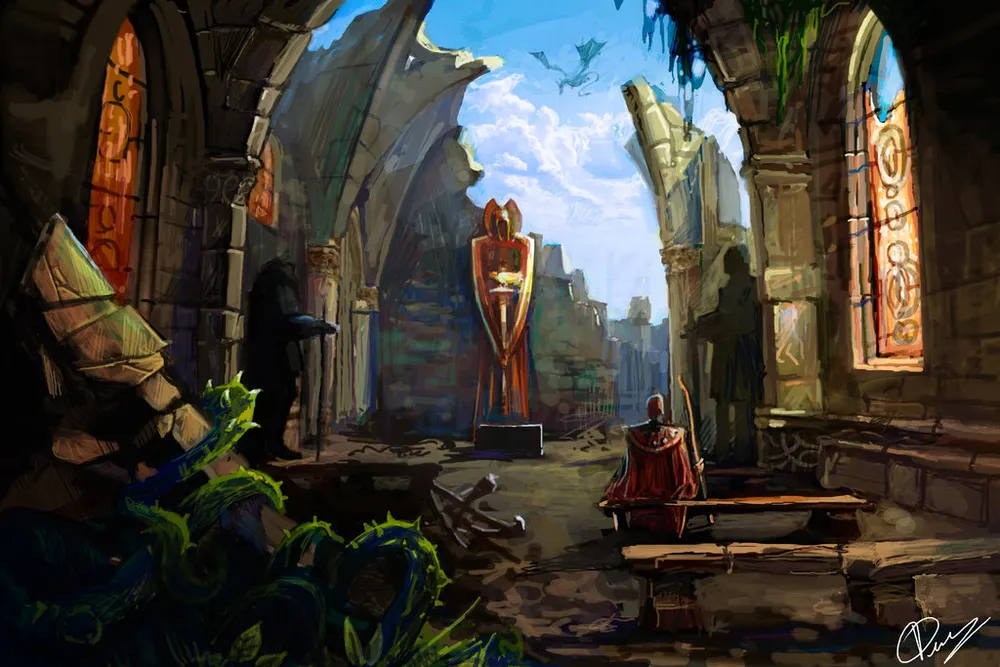 Но гнев Белиара был настолько велик, что спустился он на Землю и избрал зверя. И говорил Белиар с ним. И стал зверь его верным служителем. И отдал Белиар часть своей божественной силы зверю, чтобы уничтожить Землю. Но Иннос видел, что произошло. И спустился он на Землю и выбрал человека. И говорил с ним Иннос. И стал человек его верноподданным. И отдал Иннос часть своей божественной силы человеку, чтобы мог он уничтожить творенье Белиара.