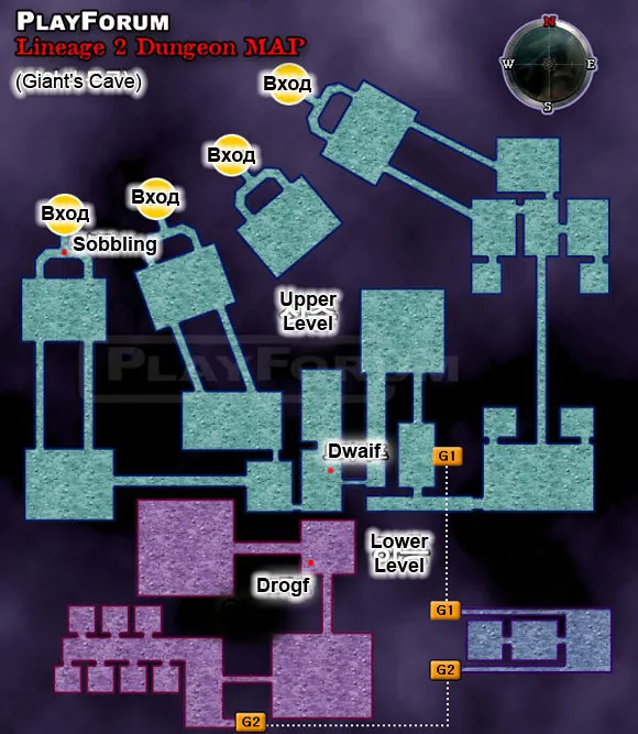 Giant's Cave состоит из двух больших частей: нижний уровень (lower level) и верхний уровень (upper level). В верхнем уровне жили медведи, пауки и подобные монстры, в нижнем уровне жили деградировавшие потомки гигантов. При входе в Giant's Cave находится NPC Sobbling, который осуществляет услуги телепорта. Попасть в Giant's Cave можно из Aden Town, пробежавшись из точки телепорта Forgotten Plains.