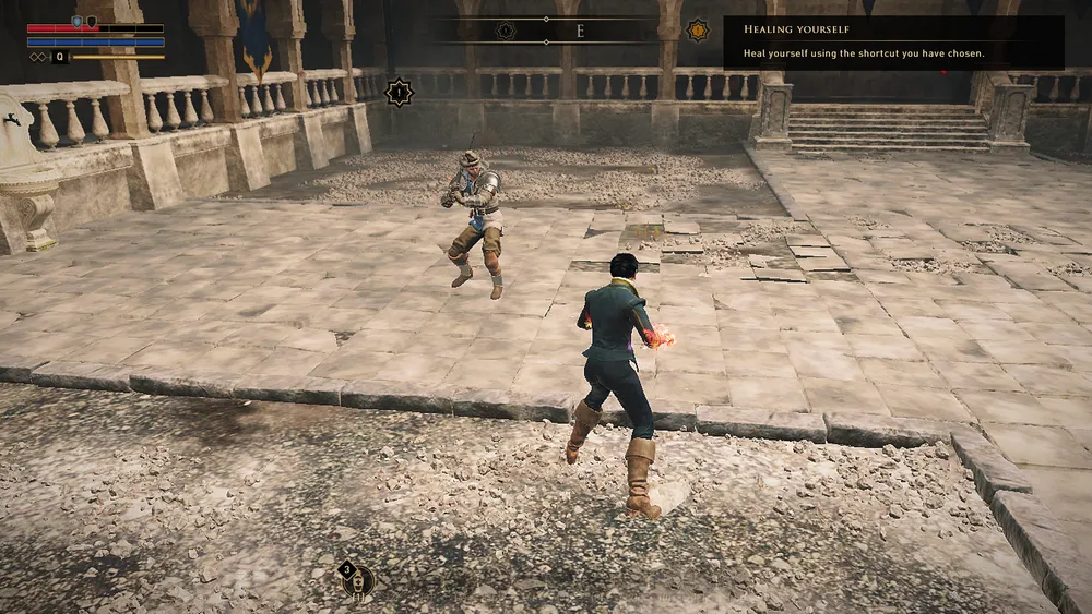 Не успеваем мы выйти из родного поместья, как к нам подкатывает наш старший товарищ Курт и выражает сомнения, что мы готовы пуститься в такое опасное путешествие, и выражает их так энергично, что становится понятно, что в его лице нас ожидает обучающая драка. Если вам не удастся уделать Курта, то проходить обучение придётся подробно, и игра выдаст вам уже двух противников (не смог побить одного, бей двоих, хе-хе).