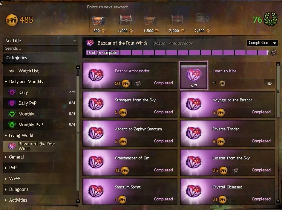 С самого начала в игре любое ваше действие имеет отражение в панели достижений. Какие сюжетные миссии вы прошли, какой выбор сделали, сколько убили мобов, каким оружием надругались над слабыми, сколько подняли союзников, сколько убили супостатов, которые посягнули на ваш сервер и т.д. И, например, в отличие от World of Warcraft в Guild Wars 2 достижения выполняются не за спасибо и не ради крутой статы (хотя для многих это важно, не будем этого отрицать), а за довольно ощутимые игровые награды, в виде экипировки, денег и прочего полезного лута.