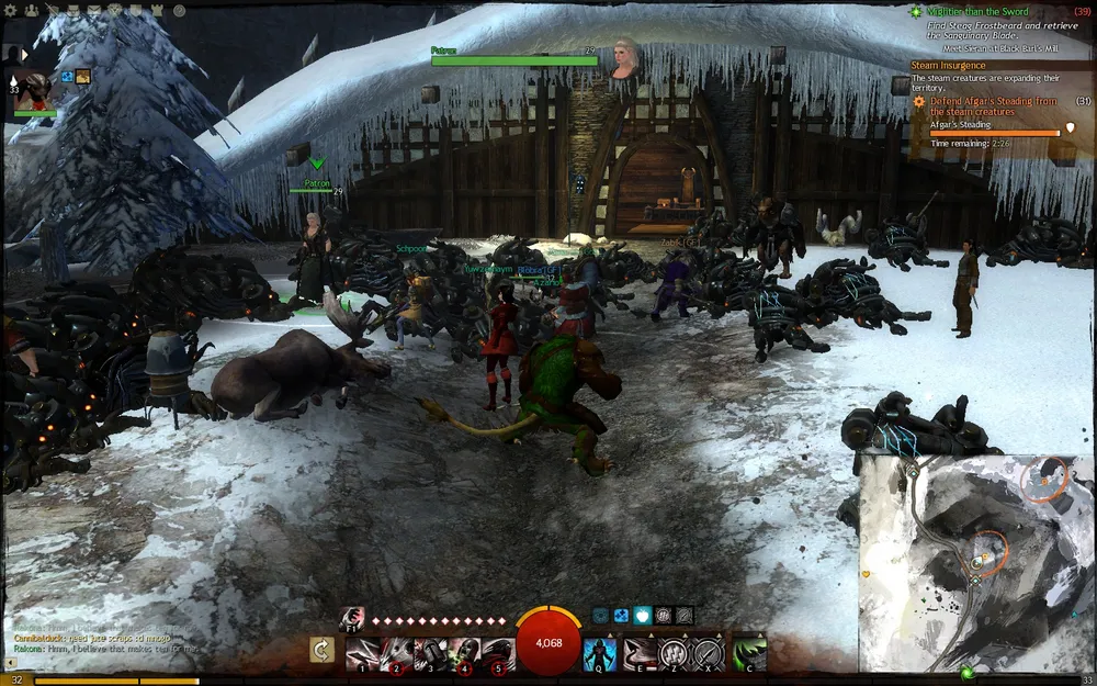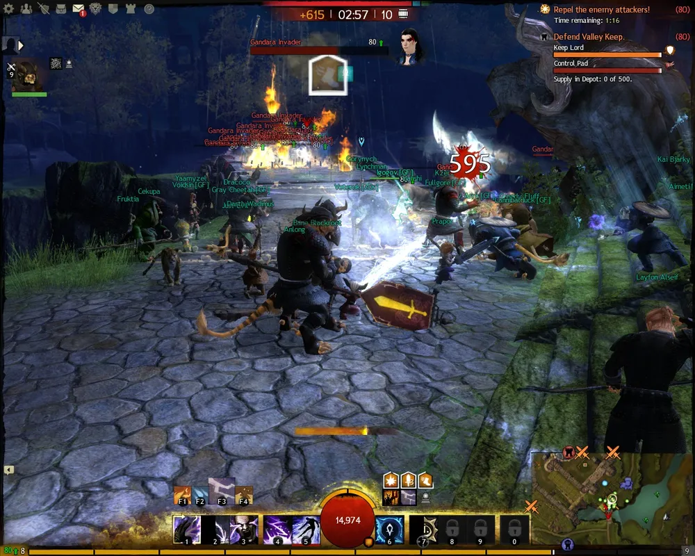 По свистку гильдмастера вся наша гильдия собралась в специальной зоне World vs World. Битвы в этих зонах проходят в нестандартном формате осад для ММОРПГ, здесь мы бьемся против двух случайных серверов европы. Задача контролировать все замки и прилегающие территории к ним и набрать как можно больше очков. По итогам недели сервер, набравший больше всего очков, получает рейтинг и бьётся уже с более сильными серверами. Боевые действия тут не утихают ни на секунду, в любой момент вы можете телепортироваться в эту зону и присоединиться к битве.