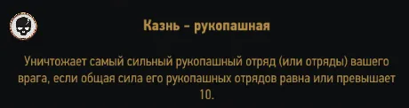 - Уничтожает самый сильный рукопашный отряд (или отряды) вашего врага, если общая его сила рукопашных отрядов равна или превышает 10