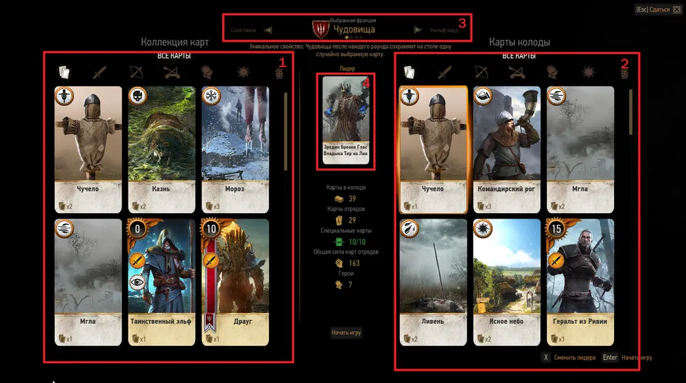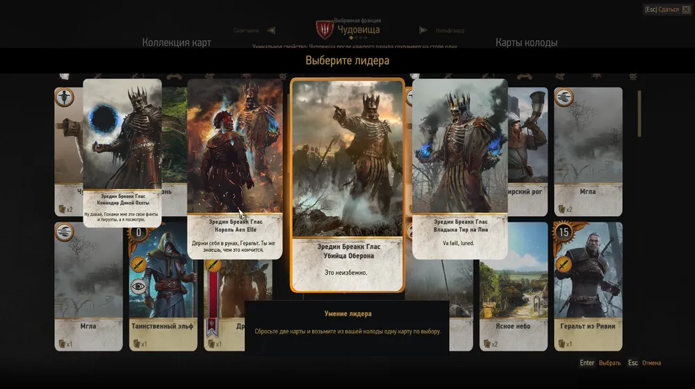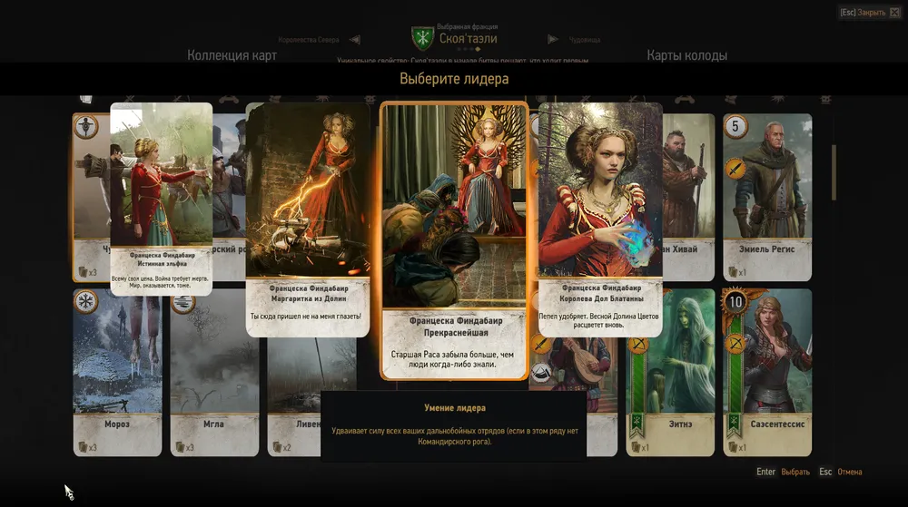 У каждой колоды есть свой лидер - это особая карта с уникальной способностью, которую можно использовать только один раз за весь матч (за все три раунда).