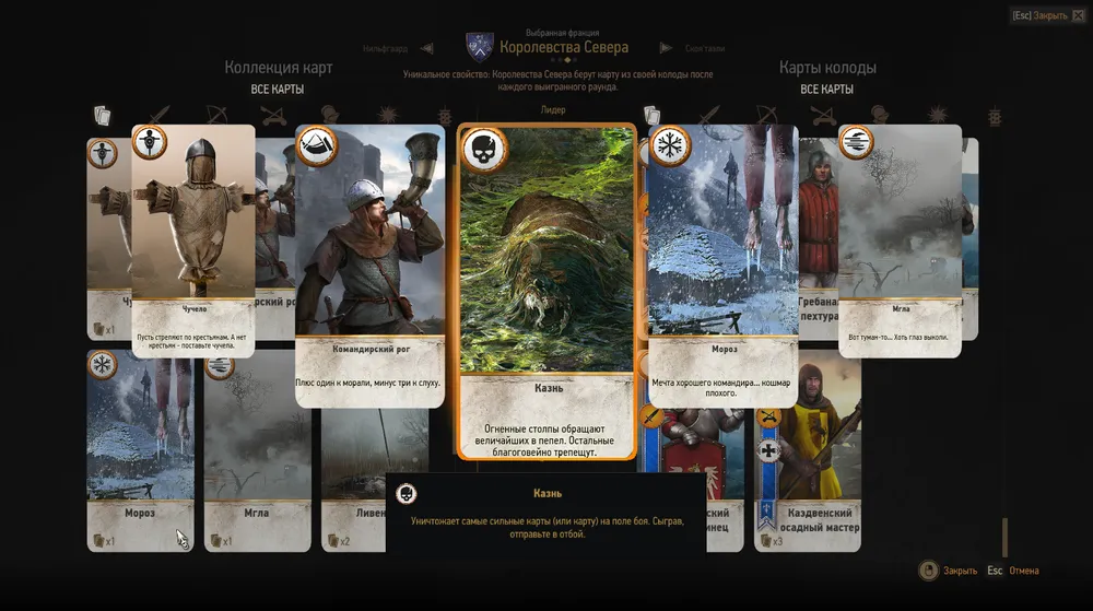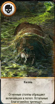 Особое место занимает карта Казнь. Это одна из двух карт во всей игре, которая уничтожает самые сильные карты на поле боя. Если имеются существа с одинаковой силой, то все они будут уничтожены, как вражеские, так и свои.