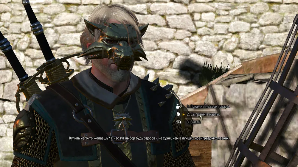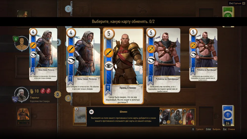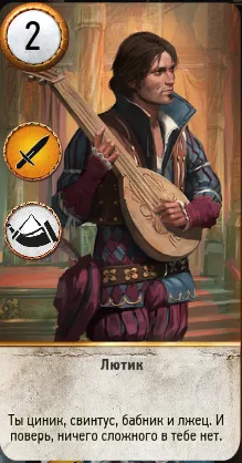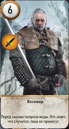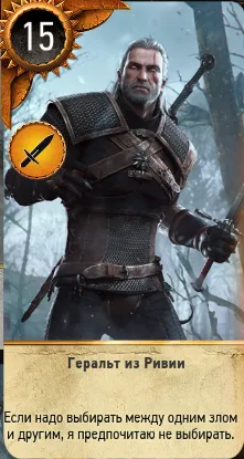 "В свое время Геральт приобрел славу искусного игрока в покер на костях. Поскольку он победил всех мастеров этой игры, ему не оставалось ничего иного, как переключиться на другие игры и собирать лавры на новом поле. Он выбрал гвинт. Поскольку Геральт собирался играть на высшем уровне, он решил собрать полную коллекцию карт, включая те, которые можно было отыграть только у лучших игроков."