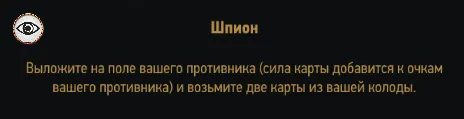 Если вы играете против Северных королевств или Нильфгаарда, то всегда старайтесь получить в стартовой руке несколько чучел. Вероятнее всего оппонент, на первом же ходу, подошлет к вам парочку шпионов. Скоя'Таели и Чудовища не имеют своих шпионов.