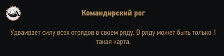 Также к специальным относятся карты, которые могут быть применены к собственным существам. Чучело возвращает вашу карту существа в руку, Командорский рог удваивает силу существ в указанном ряду.