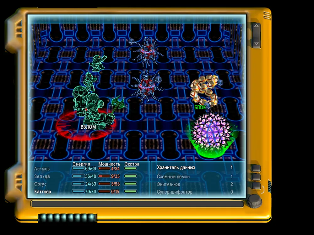 Азимов: Опущу информацию из туториала, сосредоточившись на более сложных вещах. Для абсолютных новичков замечу, что у виртуалов (членов команды игрока, олицетворяющих программный набор отдельного робота) имеются показатели энергии (аналог здоровья) и мощности (аналог маны, тратится на использование программ-заклинаний). Поединки предусматривают систему раундов, в которых каждый виртуал или алгоритм совершает одно действие, указанное в начале раунда. Очередность ходов определяется случайным образом. Наша задача – не ударить в виртуальную грязь лицевой панелью.