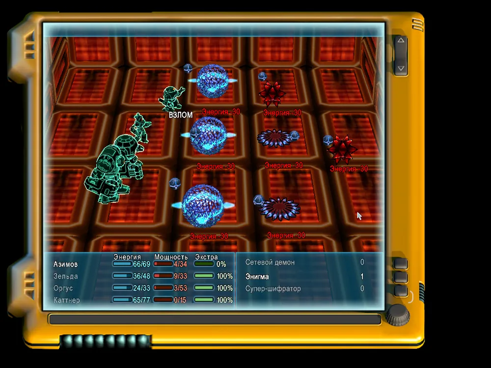 Настоящим крепким орешком середины игры станут энигмы, имеющие достаточно хороший запас энергии и пакостную возможность переливать себе энергию ваших виртуалов. В данном случае сразу после уничтожения огненных шифраторов следует бросить все силы на данные экземпляры; учтите, однако, что как специалисты по программам, энигмы обладают достаточно хорошей защитой от ваших программ, так что приоритет следует отдавать прямой атаке.