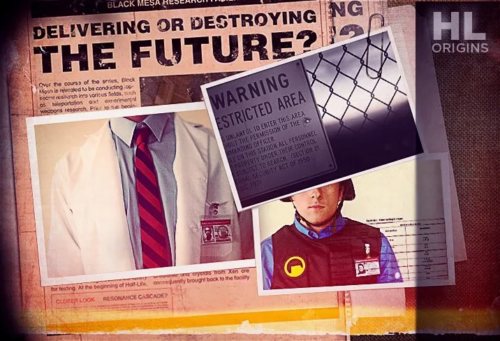 Обратите внимание на название в правом верхнем углу: “Half-Life: Origins” - похоже на заголовок нового фильма. Само по себе изображение состоит из газетной вырезки о лаборатории Black Mesa, фотографии ограждения лаборатории, фотографий работника безопасности и неустановленного учёного, щеголяющего личным бейджем, по которому можно предположить, что его хозяин - сам Гордон Фримен. Газетная заметка заимствует текст из Википедии, а конкретнее - из статьи "Локации Half-Life", раздел про Исследовательскую Лабораторию Black Mesa.