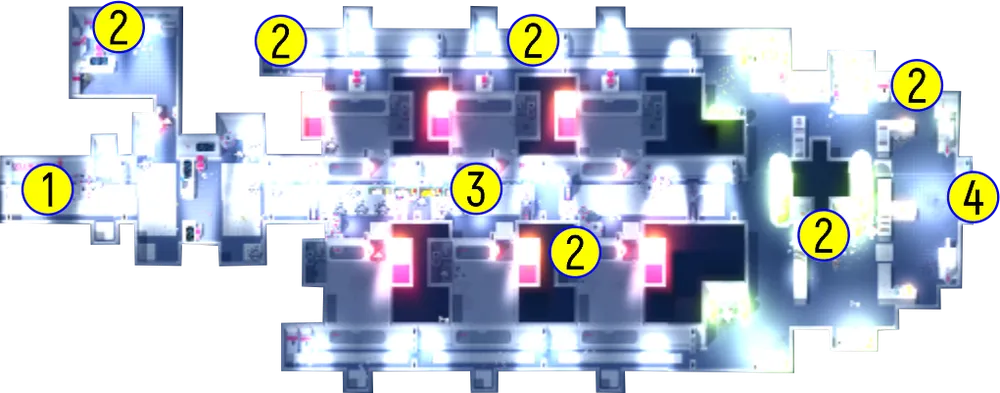 1 – начало миссии. 2 – контейнер. 3 – центральный коридор. 4 – переход в убежище.