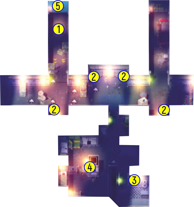 1 – начало миссии. 2 – турель. 3 – контейнер. 4 – компьютерный терминал. 5 – переход в убежище.