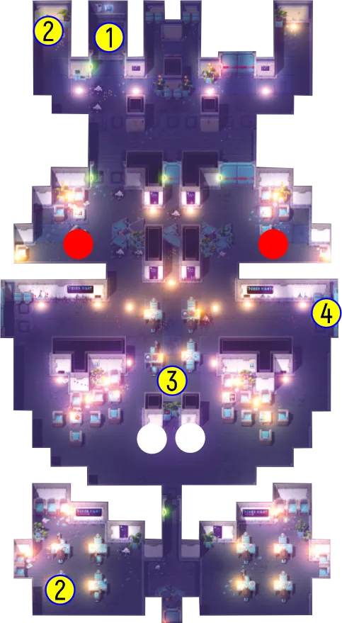Далее вам предстоит отбить нападения мутантов. После того, как с мутантами будет покончено, нужно будет уничтожить лазерную турель, обладающую смертоносным огнем и повышенной защитой. Лучше всего прокрасться вдоль стен зала и укрыться за колоннами. На плане эти места показаны белыми кругами. После того, как турель будет уничтожена, вы сможете вернуться в убежище.