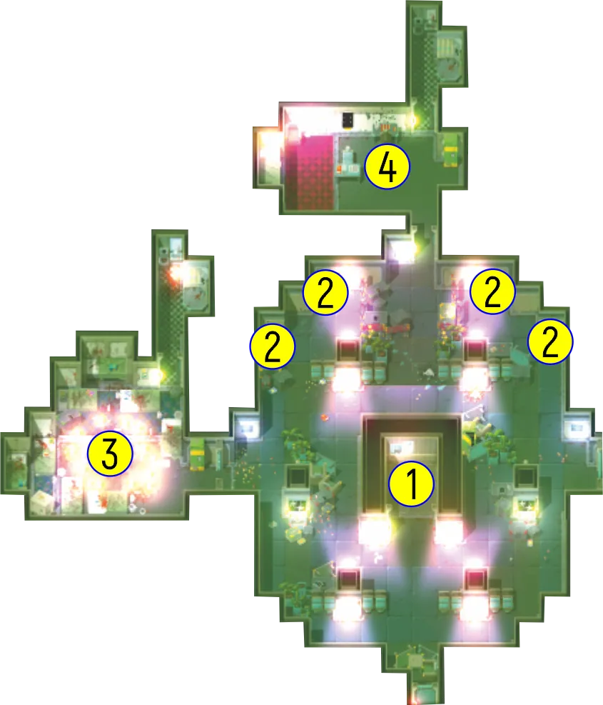 Разделите свой отряд на две группы. Ланниса, вооруженного скорострельной винтовкой Гатлинга, поместите в западном крыле зала. Рядом с ним поставьте доктора Шаффера. Доктор будет восстанавливать Ланнису энергетическую защиту брони, оказывать необходимую медицинскую помощь и принимать посильное участие в атаках на врагов, если те окажутся в зоне видимости доктора. На плане Ланнис и Шаффер показаны красными квадратами.