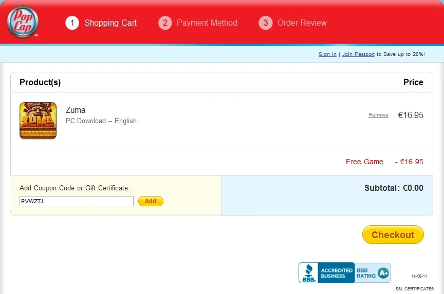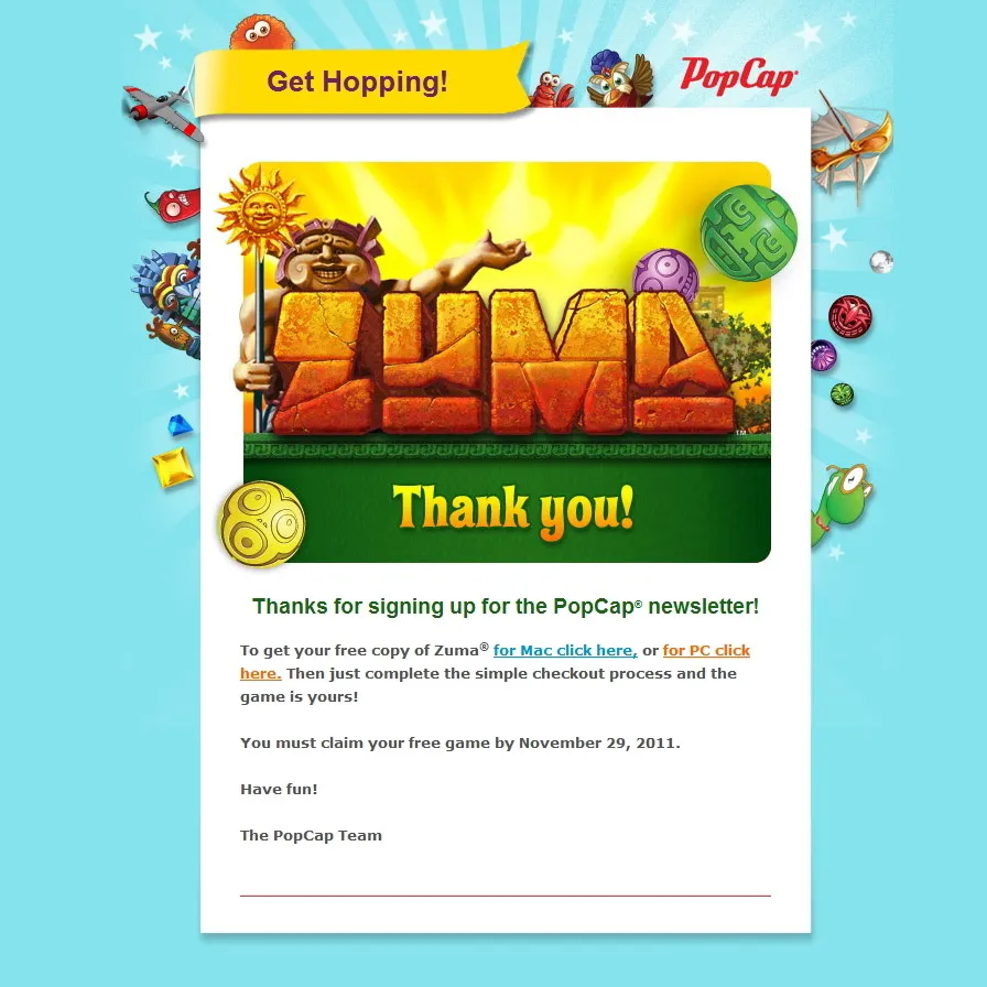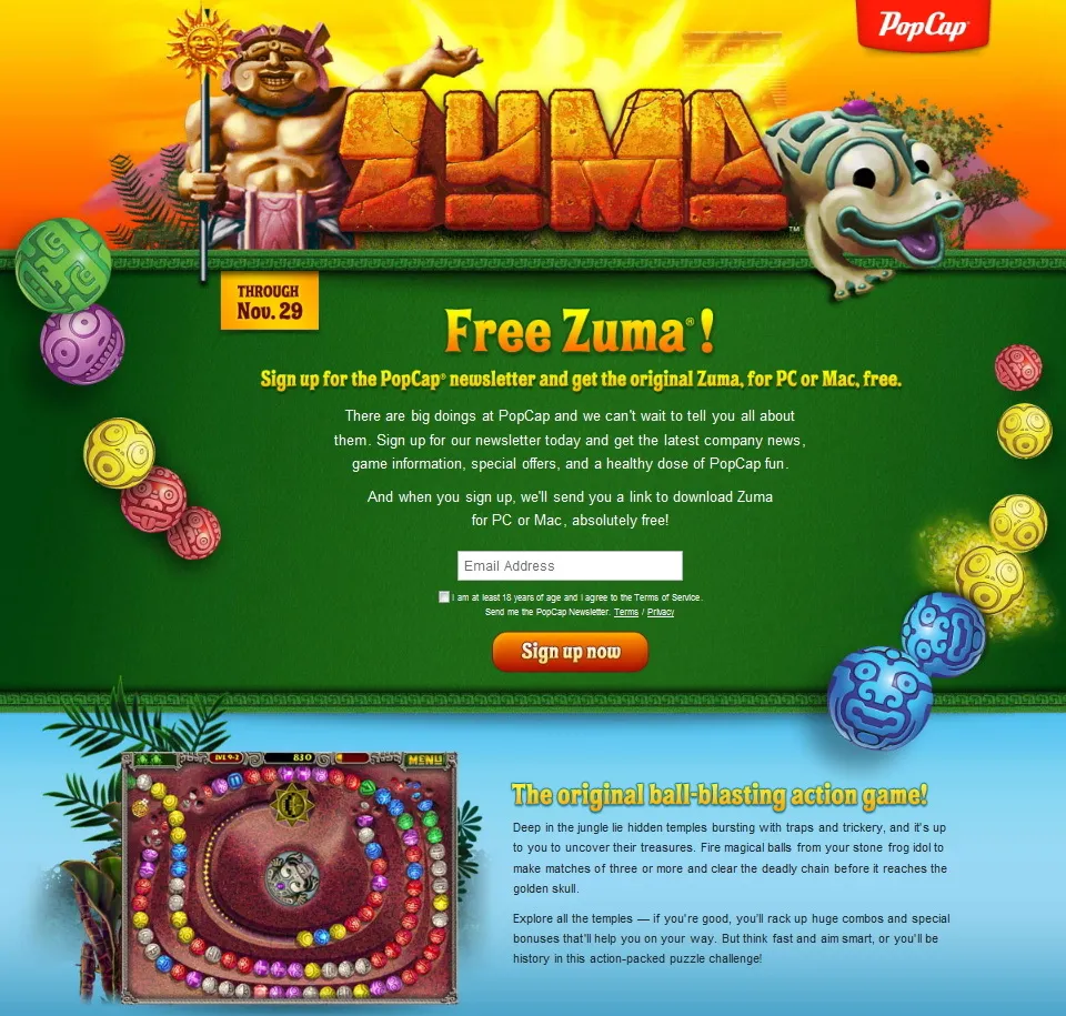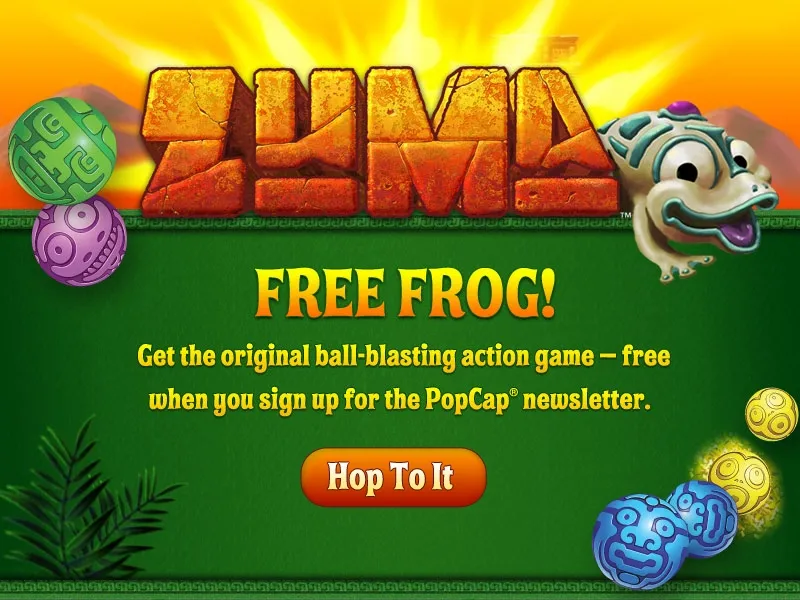 Сегодня утром увидел в твиттере сообщение от PopCap Games, что на этих выходных Zuma можно получить совершеено безвозмездно (т.е. даром)! Для тех кто любит халяву объясняю как получить: