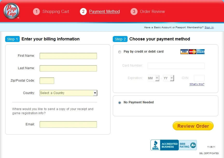 Шаг 5: Вводим Имя, Фамилию, почтовый код, страну и email. Клацаем на Review Order.
