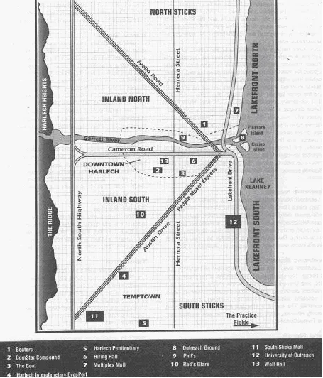 Прибрежная Деловая Зона - заброшенный район города. В оставленных складах Северного Речного дома появляются только грызуны и временные работники. Немного оставшихся больших фирм переместили свои офисы на аллеи района Южных Пальцев, где земля и арендные платы гораздо дешевле. Речная Южная область опустела почти без надежды на исправление ситуации. Район пестрит старыми пивными кабаками, такими как «Фил», «Джоэл», «Логово», «Таверна Козы» и «Клуб Пилота». За границами Харлеча в пригородном районе Агро фермеры Аутрича выращивают основные зерновые культуры на планете. Обширные сельхозугодия протягиваются тысячи километров на север, окружая Озеро Кирни.