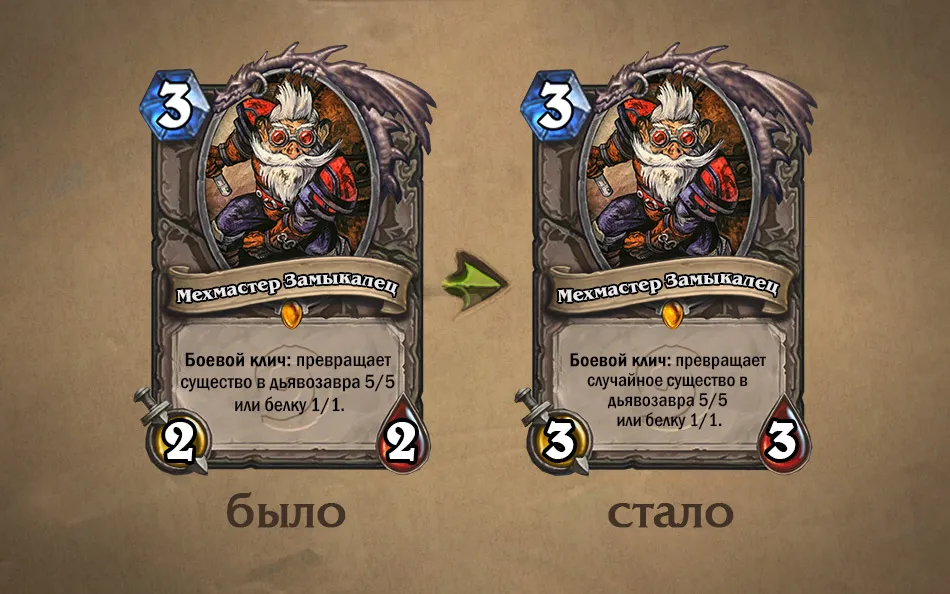 - Некоторые карты набора эксперта были изменены, а количество чародейной пыли, получаемой при их распылении, временно увеличено и равняется количеству пыли, которое изначально требовалось для их создания. Это касается карт: Нат Пэгл и Мехмастер Замыкалец