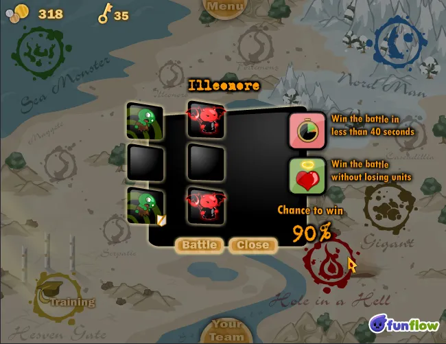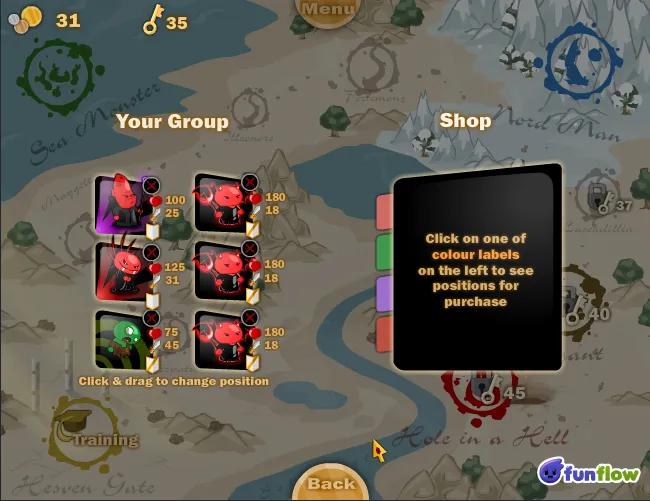Как вы уже догадались, в игре есть две стороны, Рай и Ад. Механика игры довольно знакома, особенно для тех кто играл в HoMM, Disciples и т.д. У вас есть 6 ячеек, в которые можно поставить 6 юнитов. Всего в игре 4 типа юнитов у каждой стороны. Есть стрелки, лекари, маги и т.п. Все бои в игре, в отличии от HoMM, происходят в реальном времени. Сначала вам придется пройти компанию за Рай, что бы собрать 25 ключей и открыть компанию за АД. Ключи даются за победы в поединках, так же за победы даются деньги которые вы можете тратить на покупку и прокачку войск. Каждого юнита можно прокачать, с поднятием лвл'а даются плюсы к статам. ДА, и еще в игре есть боссы :)