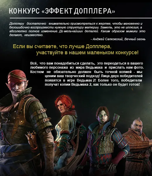 CD Projekt RED решили отпраздновать Хэллоуин взяв лица двух игроков... и вставив их в супер-мега-ожидаемый ролевой сиквел «Ведьмак 2: Убийцы Королей»! В конкурсе «Эффект Допплера» - запускаемый сегодня на официальной странице Ведьмака в Facebook, игрокам предстоит отправить свои фотографии, на которых они будут одеты в их лучшие, наиболее устрашающие или забавные костюмы, связанные с Ведьмаком, чтобы получить шанс увидеть свои лица в игре Ведьмак 2.