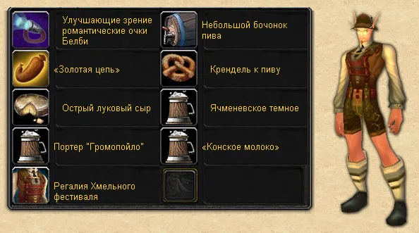 У ворот всех главных городов будут расставлены столы, за которыми каждый может угоститься кружкой свежего пенного пива. Если вы выпьете пива, не отходя от бочки в Стальгорне или Оргриммаре, один из помощников пивовара тут же передаст вам следующую кружку. Но вы можете и сами наполнить свою тару душистым напитком. Во время Хмельного фестиваля вам не придется страдать от жажды!