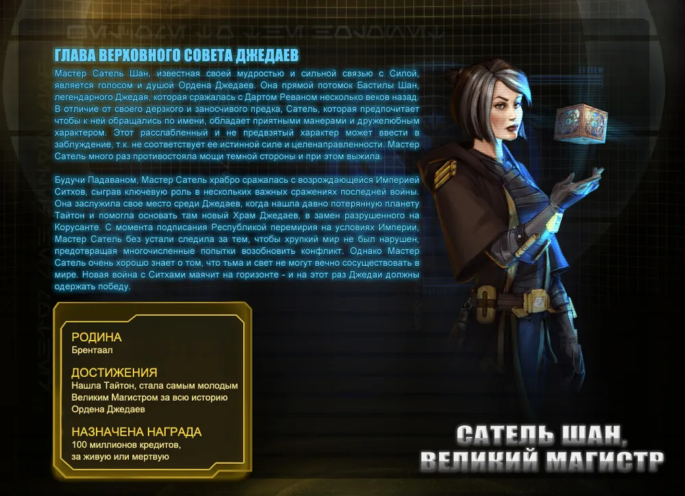 Будучи Падаваном, Мастер Сатель храбро сражалась с возрождающейся Империей Ситхов, сыграв ключевую роль в нескольких важных сражениях последней войны. Она заслужила свое место среди Джедаев, когда нашла давно потерянную планету Тайтон и помогла основать там новый Храм Джедаев, в замен разрушенного на Корусанте. С момента подписания Республикой перемирия на условиях Империи, Мастер Сатель без устали следила за тем, чтобы хрупкий мир не был нарушен, предотвращая многочисленные попытки возобновить конфликт. Однако Мастер Сатель очень хорошо знает о том, что тьма и свет не могут вечно сосуществовать в мире. Новая война с Ситхами маячит на горизонте - и на этот раз Джедаи должны одержать победу.