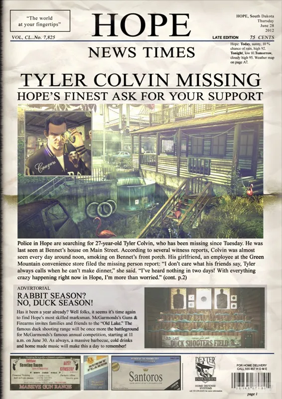 Люди, занимающиеся разработкой Hitman: Absolution взялись за виртуальную газету Hope News Times и теперь выпускают её каждую неделю. И вот мы опять можем прочитать новый выпуск. Заголовок газеты располагает: "Тайлер Колвин пропал. Если у вас есть сведения о его местоположении, просьба сообщить". Походу, наш любимый Агент 47 опять принялся убивать людей, да так что их не могут найти правоохранительные органы. Неужели он пошёл по стопам Декстера и начал расчленять своих жертв. Нет, всё намного легче, он просто скинул его в темный бассейн, в котором нельзя ничего разглядеть. Судя по всему, полиция и не разглядела или не захотела разглядывать. Но меня мучает один вопрос. Кому понадобилось убивать этого бедолагу? Вы посмотрите в каких условиях он живет жил.