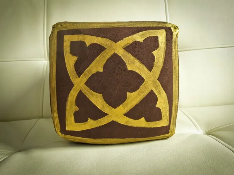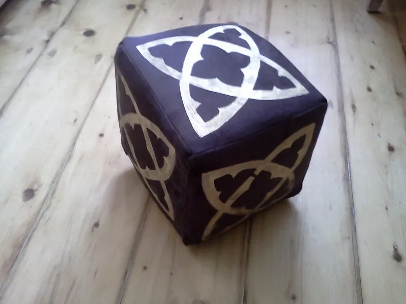 Возможно, тут мне следовало и остановиться. Но если читатель посмотрит на изображение куба в игре, он сразу скажет: «Позвольте! Ведь куб окован золотом!» — и будет прав. Может быть, следовало рисовать рамку сразу, вместе с остальным узором, но мне показалось, что ровнее будет нанести кистью линии по ребрам уже сшитого куба. На мой взгляд, вышло не так аккуратно, как мне хотелось.