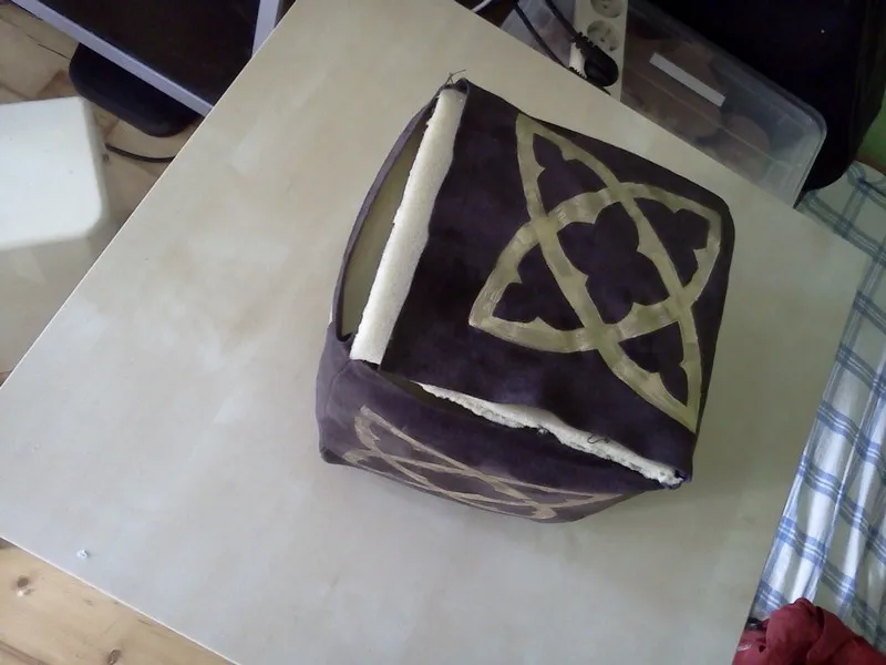 За это время можно заняться фигурной нарезкой поролона. Чем плотнее ткань, тем свободнее можно относиться ко внутреннему содержанию: благодаря крою куб останется кубическим практически при любой форме набивки. Один из вариантов наполнителя – мелко нарезанный поролон. Другой – листы поролона, нарезанные в стопку требуемого формата. Можно просто набить синтепоном, тоже неплохо будет.