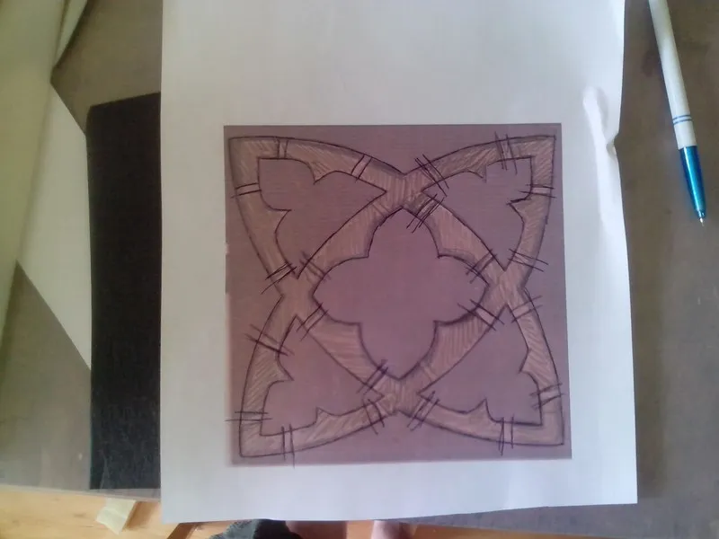 Как мы видим, узор тут замкнутый, и вырезать его просто весь будет нереально. Для того, чтобы трафарет держался одним куском, делаем вот такие перемычки. Потом эти места надо будет пройтись кистью, но, опять же, делать это следует быстро, пока слой краски не высох.