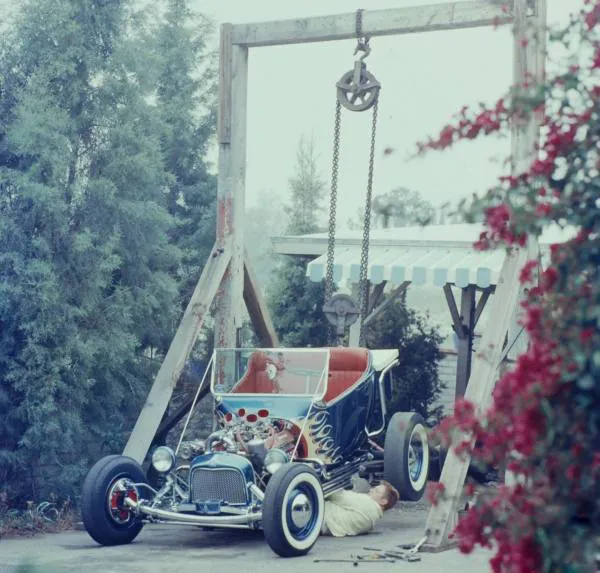Норм Грабовски (Norm Grabowski) под своей Kookie Kar (T-Bucket) – Калифорния 1950-e