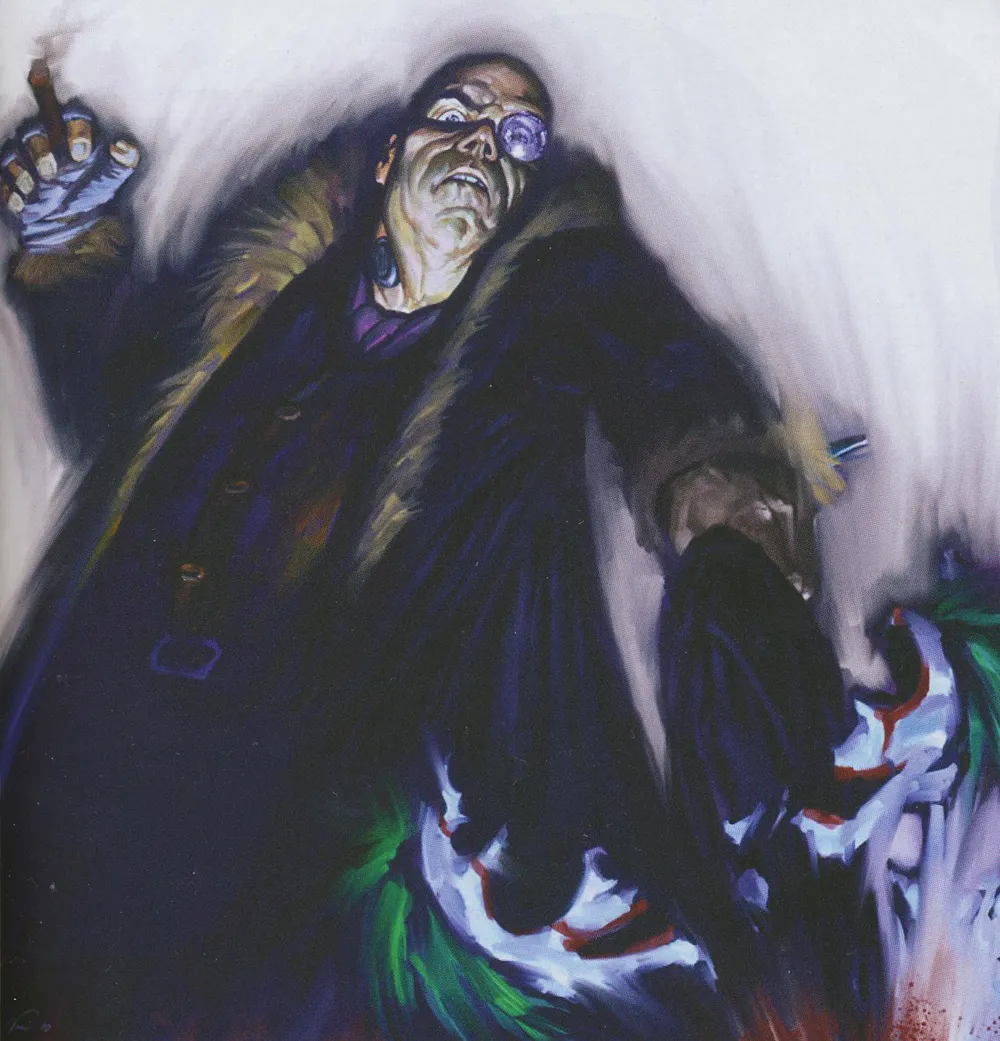 Фантастическое изображение Пингвина, найденное в немецком игровом журнале «Chief». Как видно на картинке, новый злодей явно не рад присутствию бандитов Джокера, о чём говорит разрубленная голова одного из них.