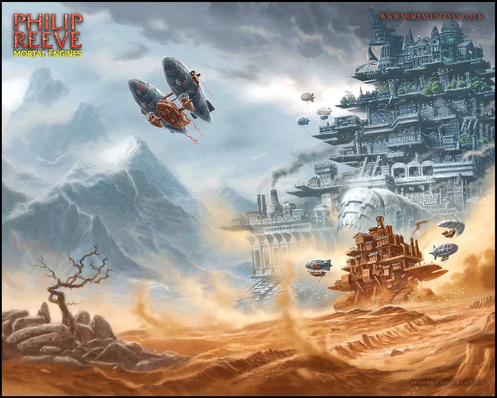 Сегодня от нечего делать решил поискать в сети – в чём смысл данного фильма? И с удивлением узнал, что он снимается по книге Филипа Рива «Смертные машины». Разумеется, тут же нашёл её электронный вариант, начал читать – и не смог остановиться, пока не закончил. Отложил все дела, задвинул в сторону игры – читал, читал.
