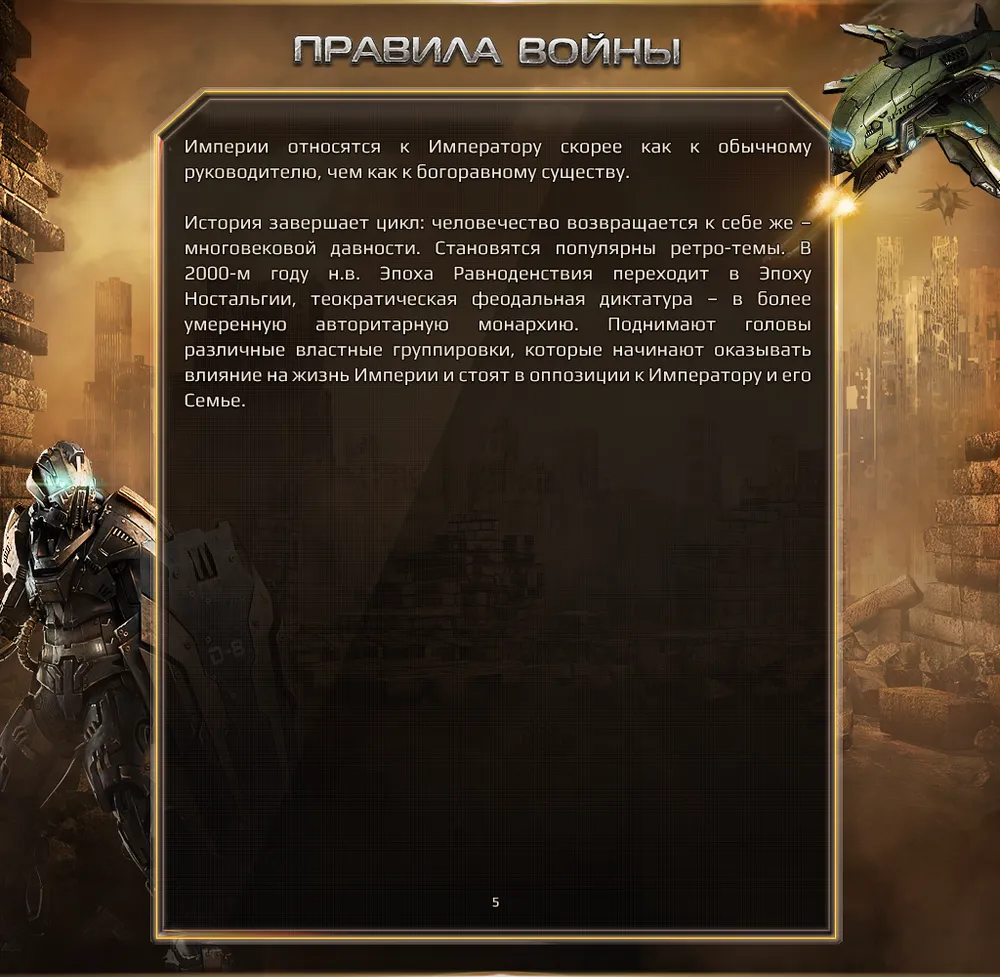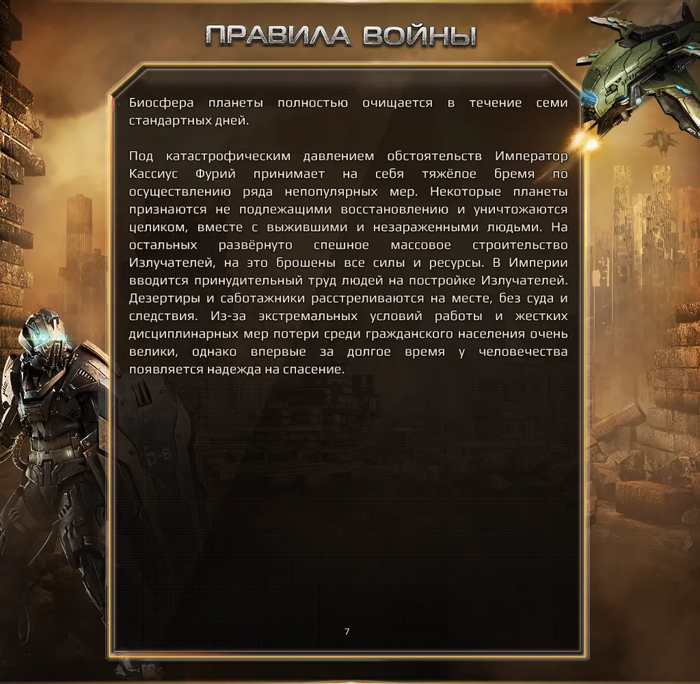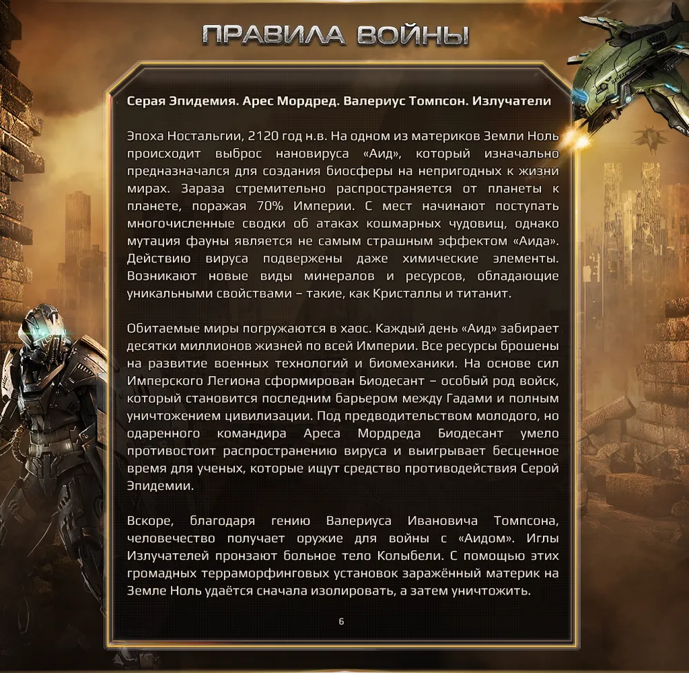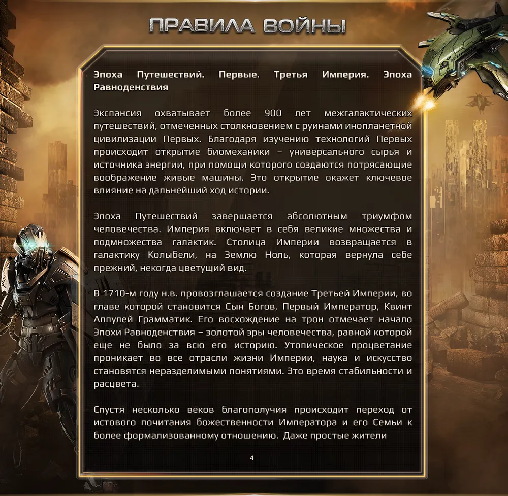 Под каждым игровым механизмом, дизайном юнита или персонажем "Правил войны" имеется солидная сюжетная основа. В табличках "Хроники Империи" исследователи могут найти ответ на вопрос - откуда появилась биомеханика, которая определила внешний вид боевой техники, а также что такое Излучатели - самая желанная цель для бойцов любого игрового клана.