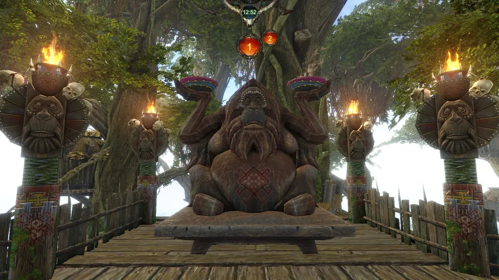 «На широком помосте, сооруженном на самой вершине Старшего древа, возвышалось мерзкое чучело обезьяны, сжимающей в своих лапах факелы. Вокруг чучела — четыре столба, увешанных черепами, рогами и личинами. На другом краю помоста стояло нечто вроде трона, на который с ногами взобрался деревенский шаман, полностью обнаженный, за исключением большой деревянной маски, целиком скрывавшей его уродливую клыкастую морду. По обеим сторонам «трона» лежали кучи выбеленных временем и солнцем черепов. Приглядевшись, мы с ужасом различили среди них даже черепа наших соотечественников — тут-то и стало ясно, какая именно участь была нам уготована. Нас, связанных, слабых от жажды, бросили на дощатый настил, служивший полом в этом отвратительном месте. Мы стонали и просили воды, но шаман, оставшийся с нами наедине, сидел на своем троне, не шевелясь, глядя в одну точку перед собой, словно сам стремился превратиться в истукана. Солнце клонилось к закату, орки начали постепенно подниматься сюда по многочисленным веревочным мостикам и лестницам. Их становилось все больше, доски настила жалобно поскрипывали под тяжелыми шагами массивных зеленых ступней, и я стал даже мечтать, чтобы старый помост не выдержал веса своих хозяев. Рухнуть вниз с такой высоты означало бы верную смерть для всех — мне и моим товарищам тоже не удалось бы уцелеть, но, по крайней мере, мы оказались бы в равном положении с тюремщиками. К тому моменту, когда солнце полностью скрылось за горизонтом, вокруг нас собралась уже вся деревня. Помост выдержал.
