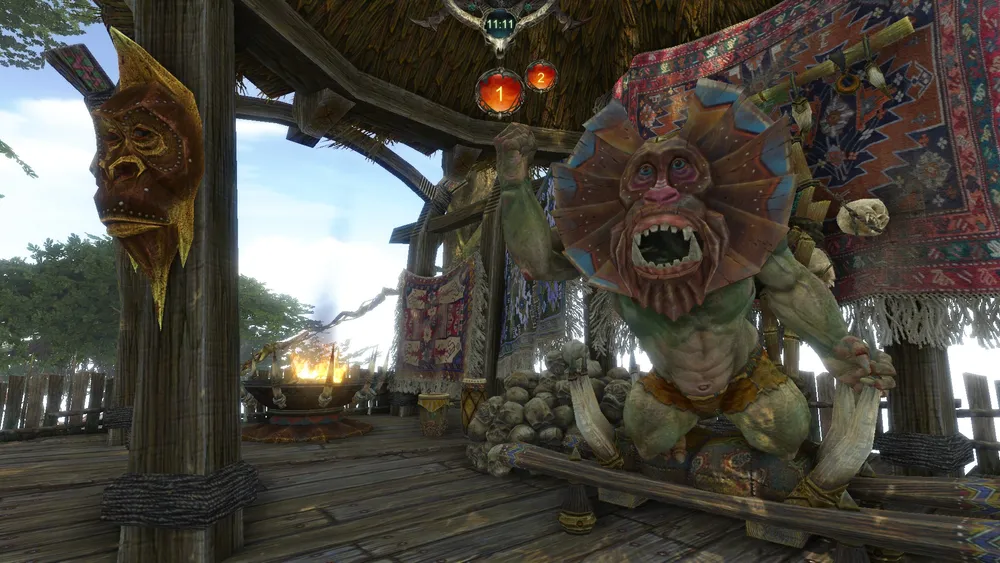 И тут откуда-то издалека донесся оглушительный, душераздирающий рев. Несколько мгновений орки недоуменно переглядывались, а потом со всех ног рванули в разные стороны, помчались по хлипким мостикам вниз — только шаман остался на месте, не имея сил вырваться из цепкого взгляда своей ужасной богини. Внизу, в темноте началась какая-то возня, раздавались хриплые, отрывистые приказы, лязгало оружие. Орки спешно готовились к схватке. Я понял, что Гранитные Предки, смилостившись, даровали мне и моим товарищам шанс на спасение. Извиваясь, словно уж, подполз я к шаткому деревянному мостику и покатился по нему вниз, надеясь, что удача не отвернется от меня. Ранее, когда нас поднимали к идолу, я заметил на нижнем ярусе нечто вроде стойки с оружием — и теперь стремился к ней. Оказалось, зеленокожие успели расхватать все, кроме старого ржавого тесака — но мне хватило и его иззубренного лезвия, чтобы перерезать веревки, стягивавшие мои запястья. Освободившись от пут, я подхватил тесак и вернулся к товарищам. Внизу уже кипела битва - на деревню вероломно напало соседнее орочье племя. Подобное не редкость для этих дикарей. Свистели в воздухе тяжелые керны, громыхали по костяным щитам дубины и каменные топоры, отборная ругань рвала ночь на части.