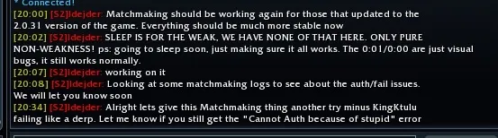 Прошлой ночью мы подняли систему в нормальном режиме. Были обнаружены проблемы со статистикой, всё остальное было нормально. Ночью, когда большинство ребят из S2 попытались немного поспать, начали появляться другие проблемы. Проблемы со статистикой никуда не исчезли, к ним добавилось некорректное поведение чат сервера. Мы изучаем эту проблему, чтобы восстановить функционирование ХоНа снова.