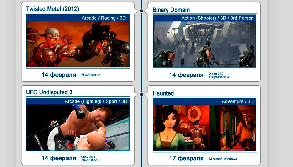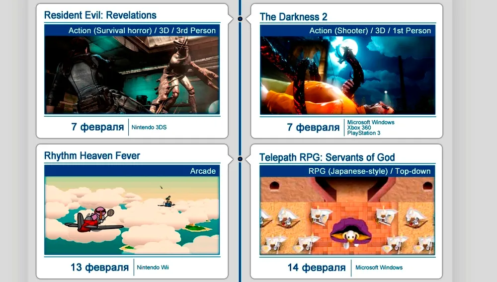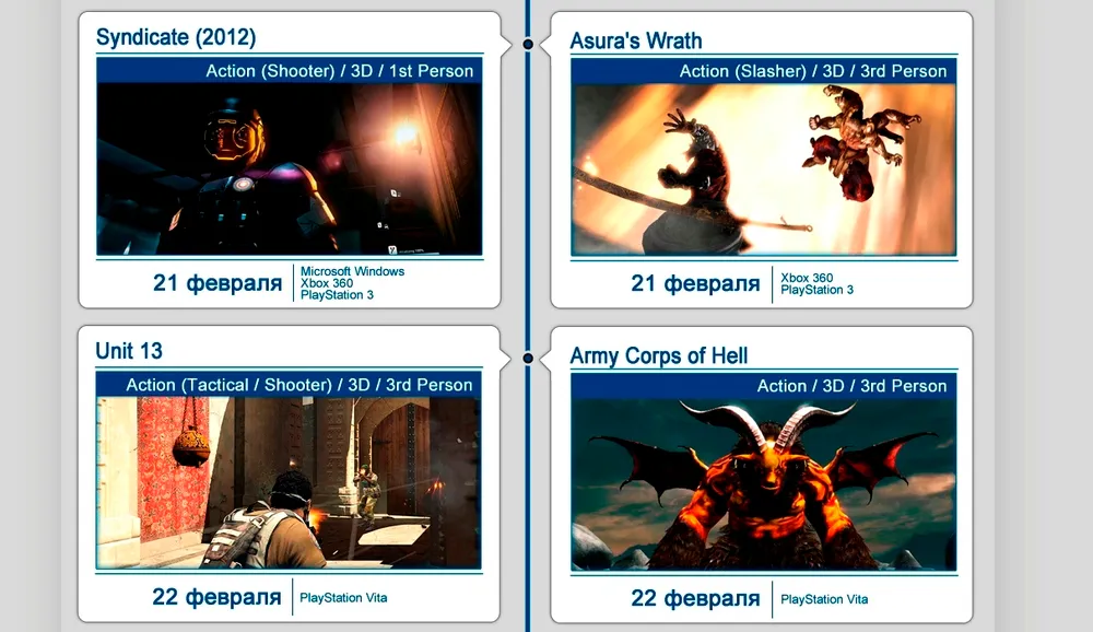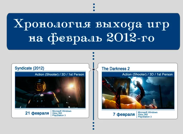 Как можно заметить открыв спойлер февраль будет очень богат на релизы, хоть и не качественные, и не для всех платформ, но всё же. Самыми выделяющемися (по моему мнению) являются Syndicate и The Darkness 2 (потому они на лого).
