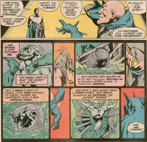 Кое-кто платить не захотел. А тайну захотел. А платить нет. Это был некий Руперт Торн, один из крупных мафиозных боссов Готема того времени. Гипергопники Стрейнджа хоть и были размеров внушительных, иммунитетом к свинцу, выпущенному из огнестрельного оружия, наделены не были. Потому полегли на пыльну земельку все до единого. Самого Стрейнджа Торн дюже отсадомировал, дабы тот выдал страшный секрет, но профессор молчал.