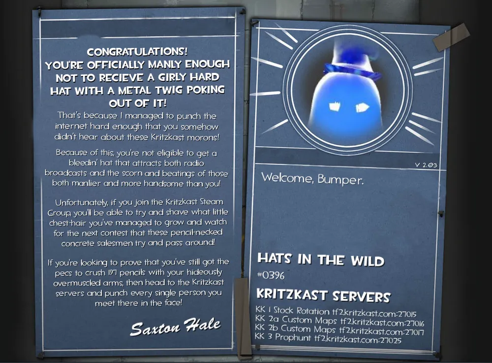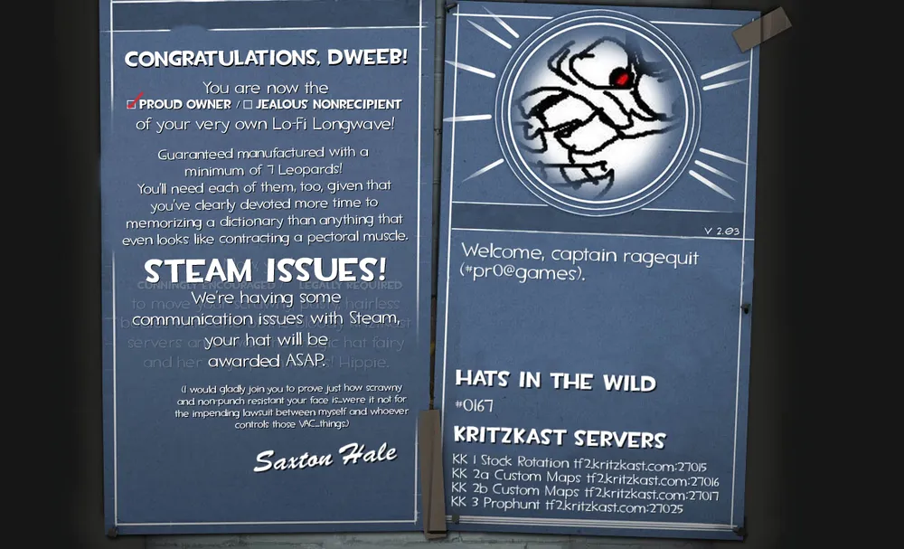Итак, пару дней назад был запущен счетчик на сайте KritzKast, который определенно предвещал что-то грандиозное. Скажу сразу: анонса Meet the Medic не произошло, никто не умер, про обновление ни слова. А в центре внимания опять оказались... Правильно, шапки. За полчаса до конца отсчета сервер внезапно рухнул от наплыва задротов посетелей, но через некоторое время народ начал догадываться, что нужно лезть на эту страницу. Как оказалось, после конца подкаста началась раздача шапок, причем в ограниченном количестве. Интересно, что шапки не передаются, их нельзя будет ни скрафтить, ни получить выпадением. А теперь самое интересное: для получения шапки нужно было состоять в группе KritzKats в Steam до начала раздачи. Но и этого было недостаточно, ведь тогда шапка не была бы настолько редкой. При переходе на страницу, написанную выше, тем игрокам, которые состояли в этой группе задавалась цепочка вопросов по всем подкастам KritzKats, причем для каждого участника вопросы совершенно разные. Последний подкаст был по счету 121, так что это более чем трудное задание. Ну а если вы прошли все эти испытания, то можете гордиться, что получили этот... агрегат в свое распоряжение! Все счастливчики оповещаются вот таким шуточным сообщением от главы Манн Ко: