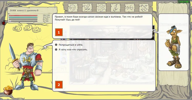 Диалоговая подача. Большинство браузерок и мини-клиентских игр (как пример любая игра IT-Territory. Выглядит примерно так как на картинке: реплика NPC, несколько вариантов ответа игрока, в зависимости от ответа игрока выдается соответствующая реплика NPC и так далее, до некоего логического завершения. Как правило, в репликах NPC и игрока следует обширное описание "кто, кого и почему" должен порезать на мелкие кусочки.